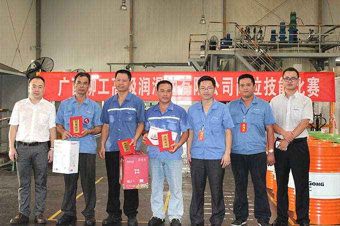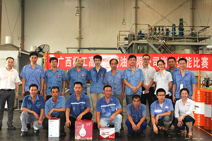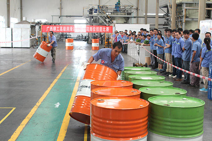 ? ? ? ? 2014年6月26日,廣西柳工高級潤滑油有限公司崗位技能比賽在調(diào)合廠正式拉開序幕。隨著裁判清脆的一聲哨響,200L油桶轉(zhuǎn)移比賽正式開始。“加油,加油!”的助威聲在調(diào)合廠車間此起彼伏,經(jīng)過緊張激烈的角逐,譚定羽獲得第一名,謝永華、李占擴分別獲得第二、三名。