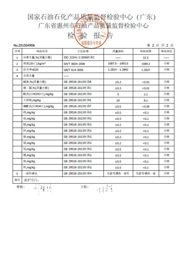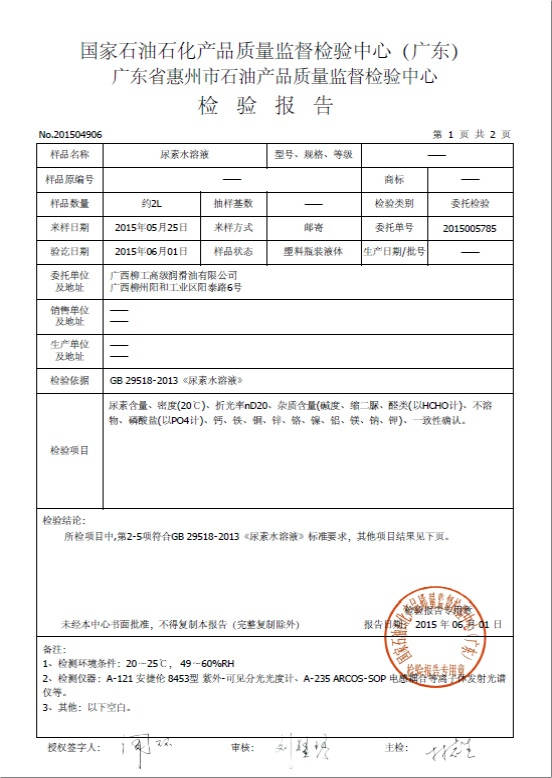 ? ? ? ? 2015年6月1日,我司的“馭藍柴油尾氣處理液”通過了第三方——國家石油石化產(chǎn)品質(zhì)量監(jiān)督檢驗中心(廣東省惠州市石油產(chǎn)品質(zhì)量監(jiān)督檢驗中心)的檢測,其中多個檢測項目包括:密度、折光度、堿度、縮二脲含量、醛類指標、不溶物含量、磷酸鹽含量,檢測出來的指標都遠遠低于國家規(guī)定標準,其他的重金屬鋁、鈣、鉀、鈉、銅、鐵、鎂、鎳、鋅、鉻都均未檢測出來,就連紅外定性也與標準譜圖一致,相關技術指標均符合國家GB 29518-2013《尿素水溶液》的嚴格標準,最后“馭藍”順利地拿到了合格的檢測報告。