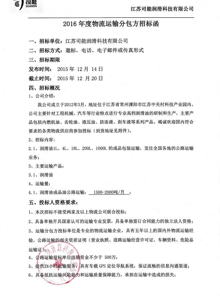 2016年度物流運輸分包方招標函
