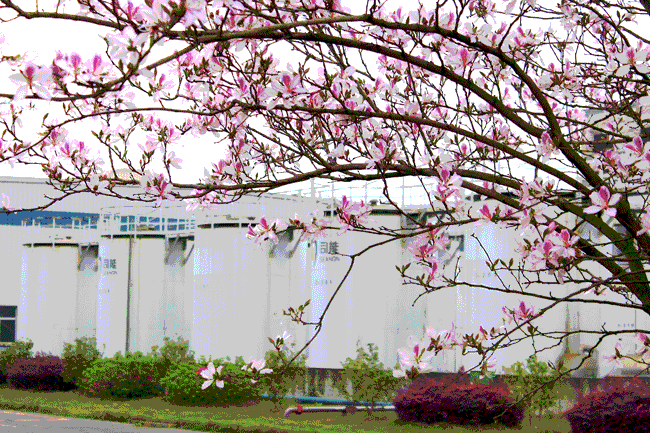 司能石油化工有限公司廠區內的紫荊花一夜之間競相怒放,真有一番“夜來風雨聲,花‘開’知多少”的情趣!